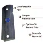 The black rosewood finish pairs cleanly with blued, stainless, or parkerized frames. The Blue Colt Medallion delivers a custom look straight out of the box.
