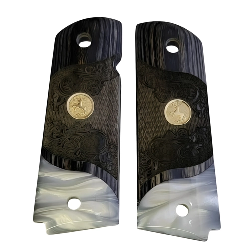 The gold rearing horse medallion is the defining feature here. Set against deep carved black rosewood and a contrasting acrylic pearl inlay, it delivers the iconic rampant horse finish that Colt 1911 grips are celebrated for — bold, classic, and unmistakably deliberate.