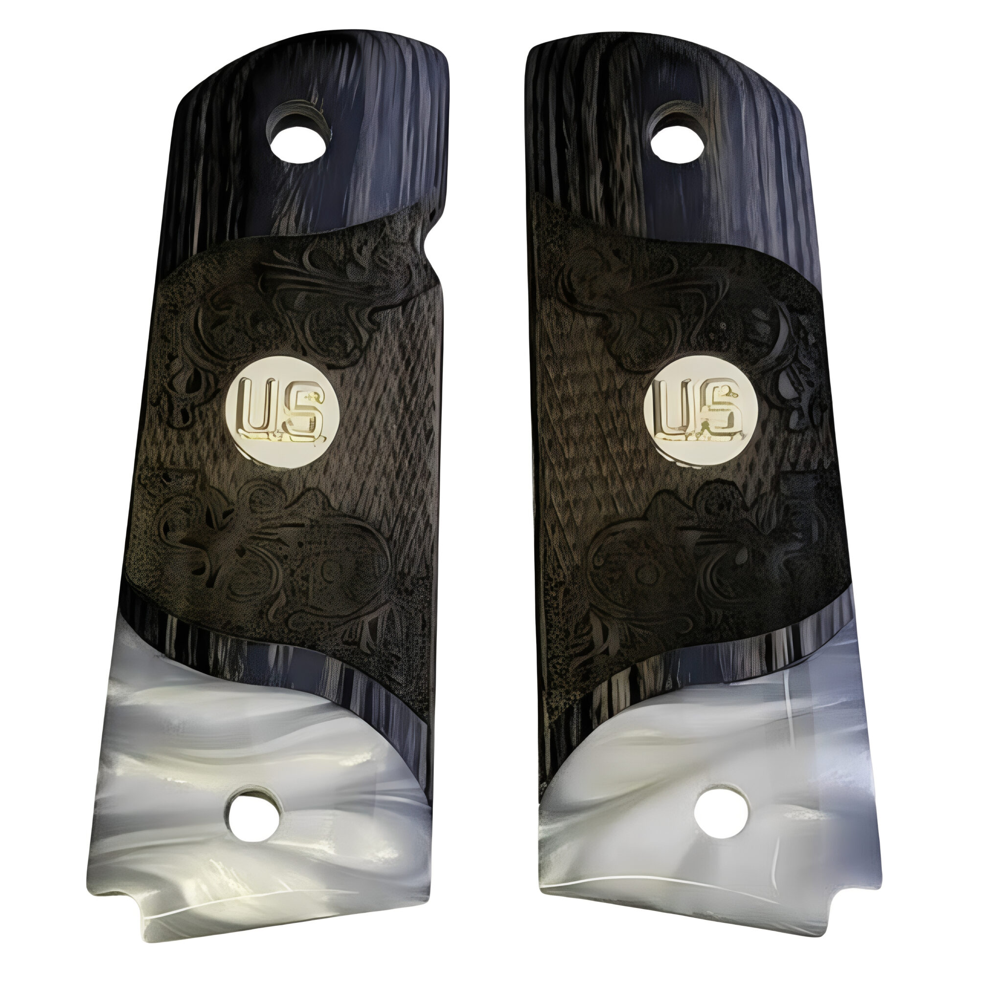 1911 Full Size Carved Black Rosewood Grips w/Acrylic Pearl and Gold U.S. Medallion