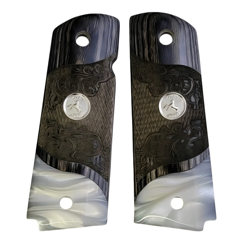 1911 Full Size Carved Black Rosewood Grips w/Acrylic Pearl and Silver Medallion with Rearing Horse