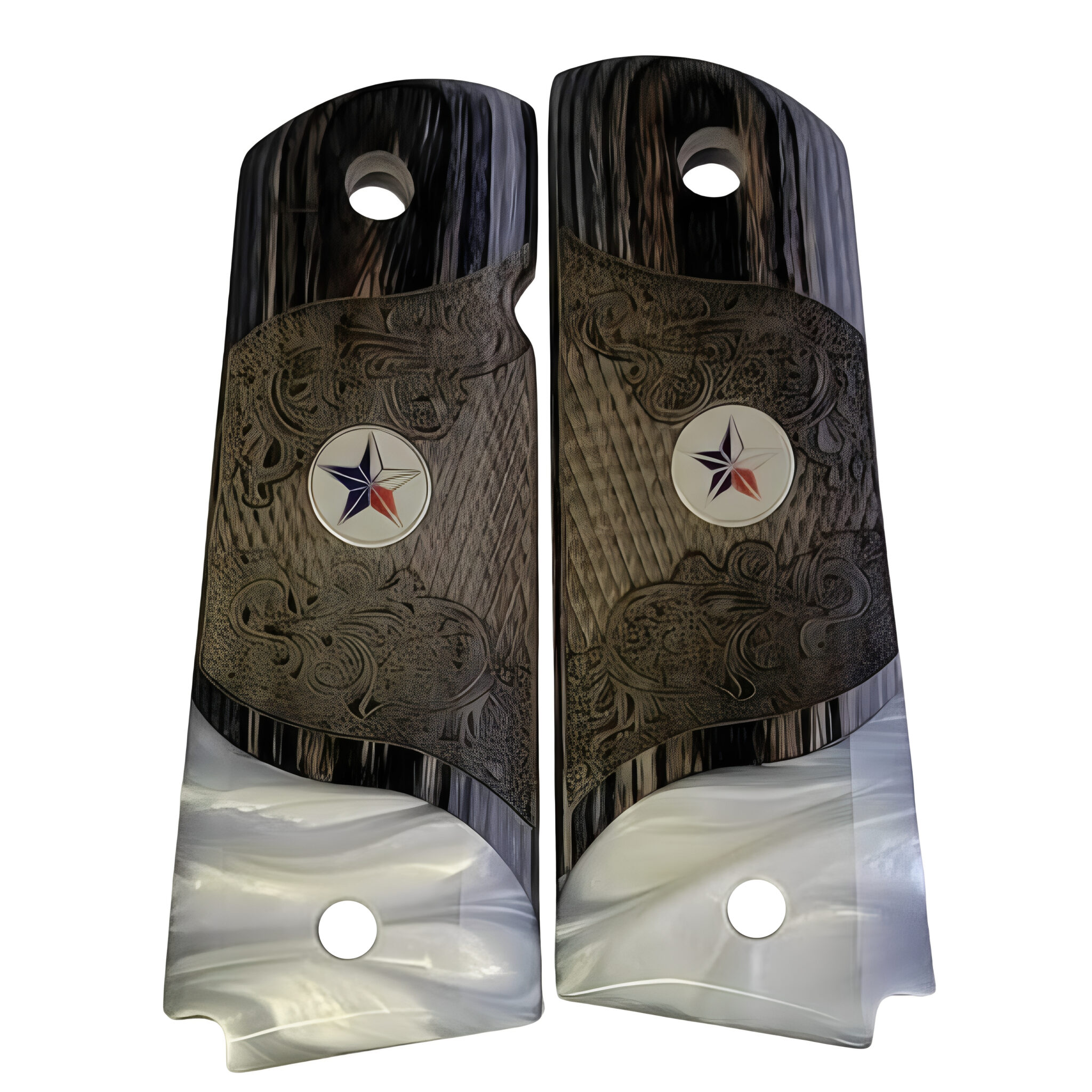 1911 Full Size Carved Black Rosewood Grips w/Acrylic Pearl and Texas Star Medallion
