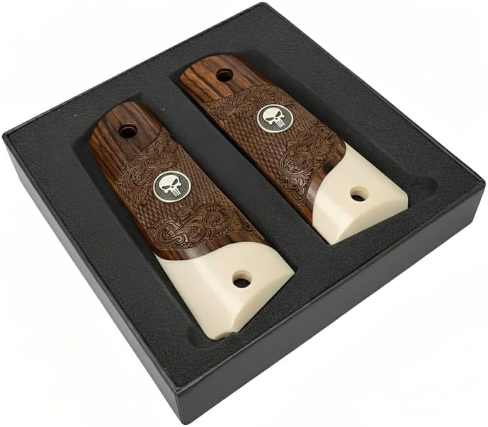 Home / New Product / 1911 Full Size Carved Rosewood Grips w/Acrylic Ivory Accent with Black PunisherMedallion