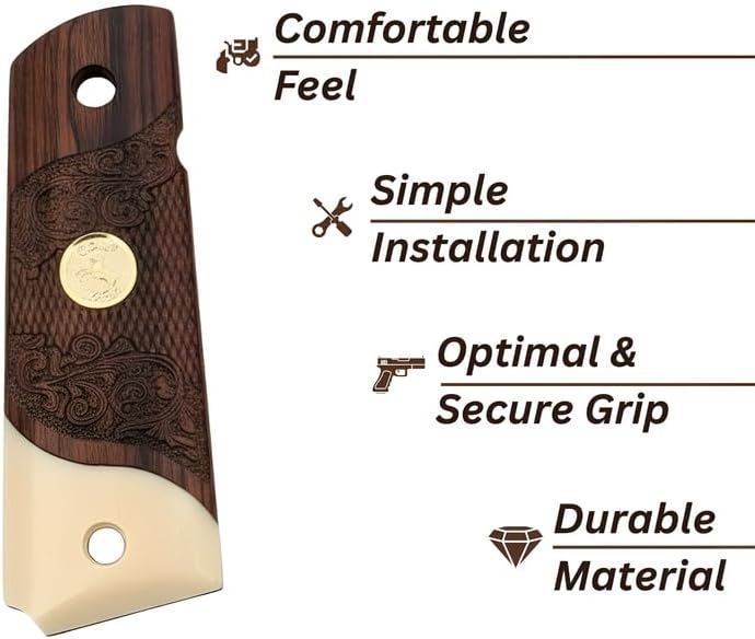 Upgrade your 1911 with these premium 1911 Full-Size Carved Rosewood Grips, crafted from high-grade rosewood laminate and detailed with a smooth acrylic ivory accent at the base. Built for durability, performance, and aesthetics, these grips add a classic yet custom look to any compatible full-size Government 1911.