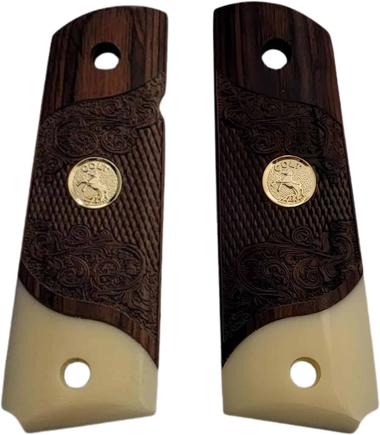 1911 Full Size Carved Rosewood Grips w/Acrylic Ivory Accent with Gold Colt HorseMedallion