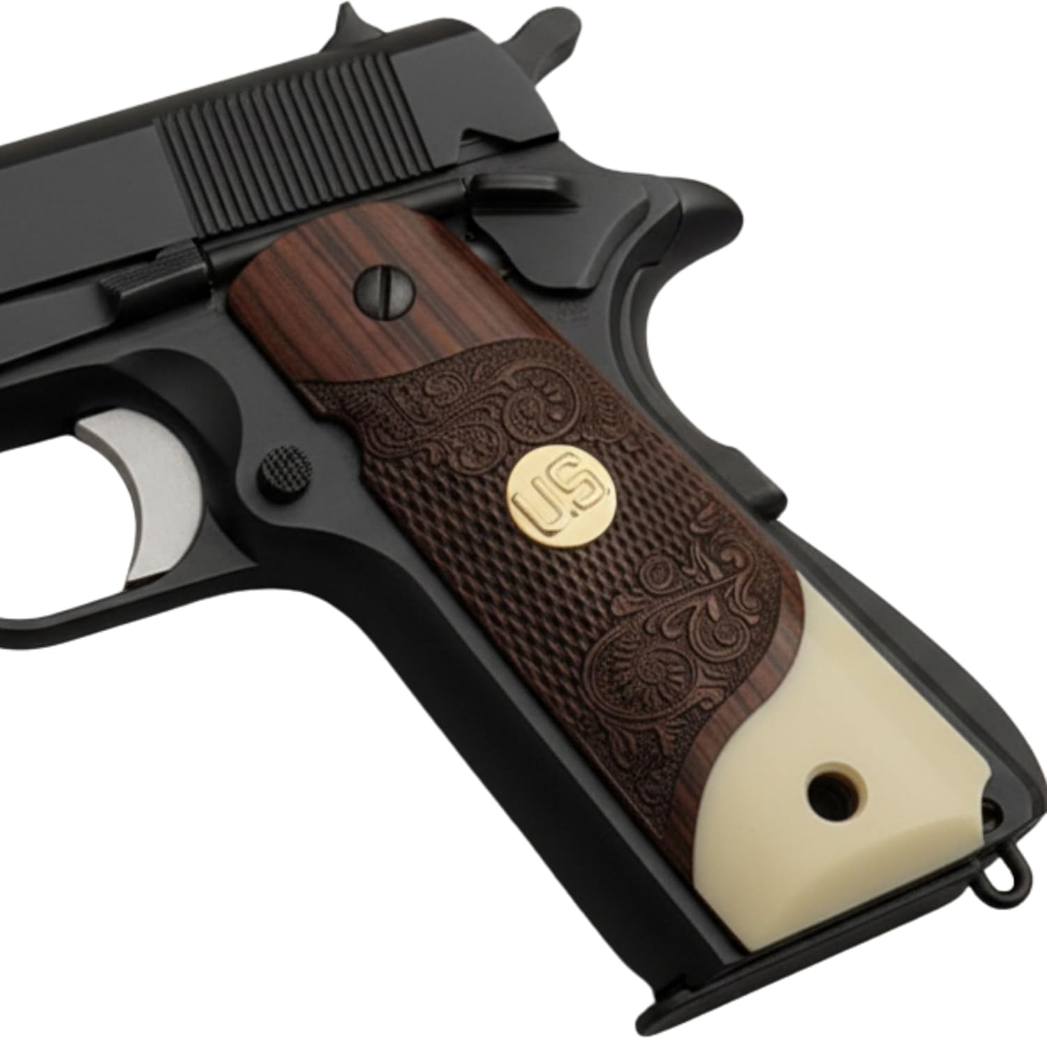 Upgrade your 1911 with these premium 1911 Full-Size Carved Rosewood Grips, crafted from high-grade rosewood laminate and detailed with a smooth acrylic ivory accent at the base. Built for durability, performance, and aesthetics, these grips add a classic yet custom look to any compatible full-size Government 1911.