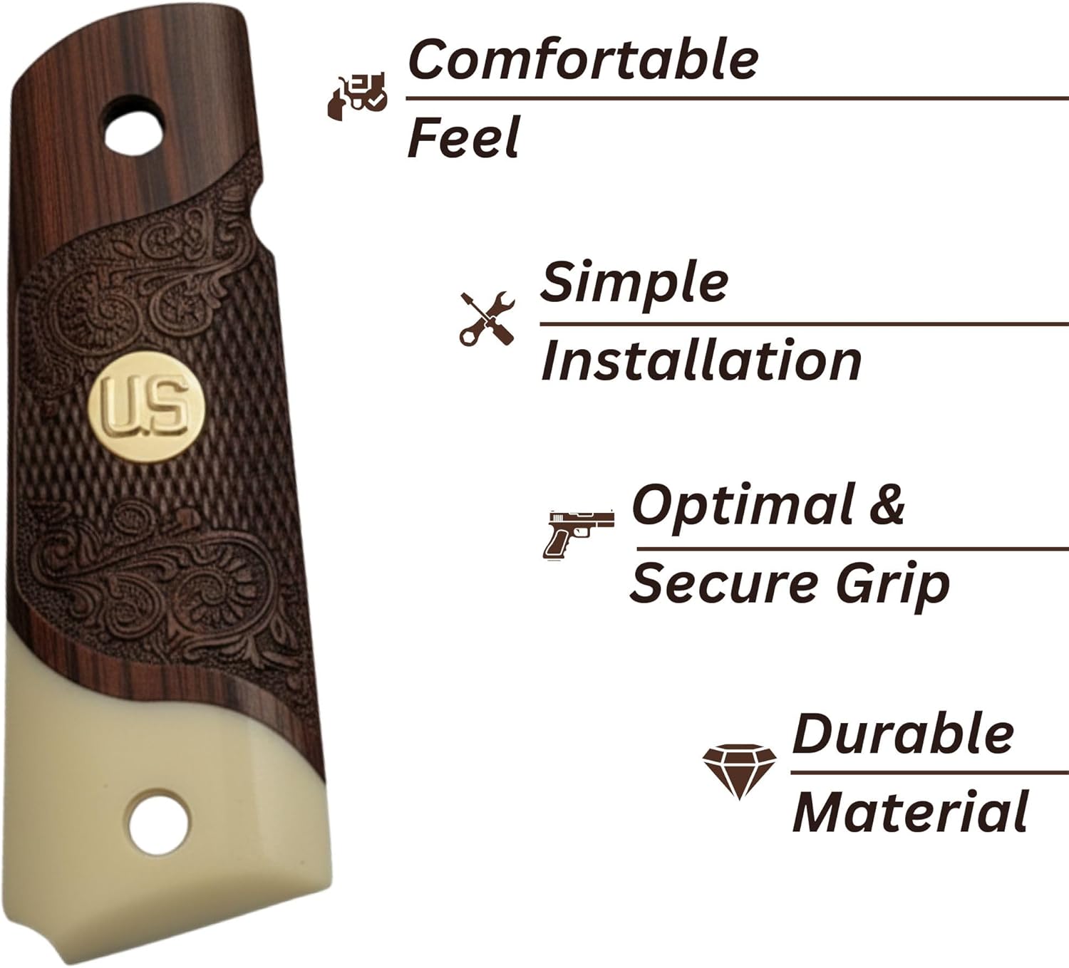 1911 Full Size Carved Rosewood Grips w/Acrylic Ivory Accent with Gold U.S. Medallion