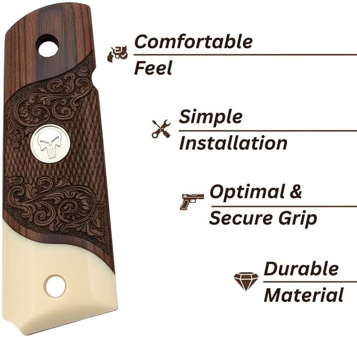 Upgrade your 1911 with these premium 1911 Full-Size Carved Rosewood Grips, crafted from high-grade rosewood laminate and detailed with a smooth acrylic ivory accent at the base. Built for durability, performance, and aesthetics, these grips add a classic yet custom look to any compatible full-size Government 1911.