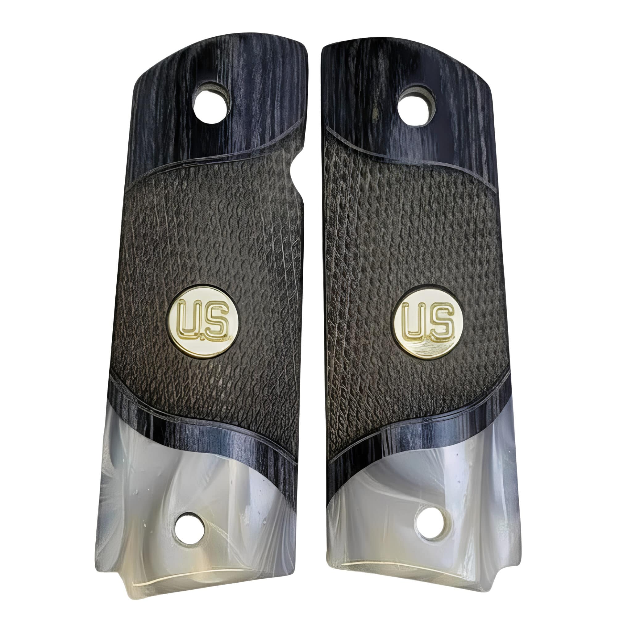 Checkered black rosewood 1911 grips full size with acrylic pearl accent and gold medallion featuring raised U.S. letters