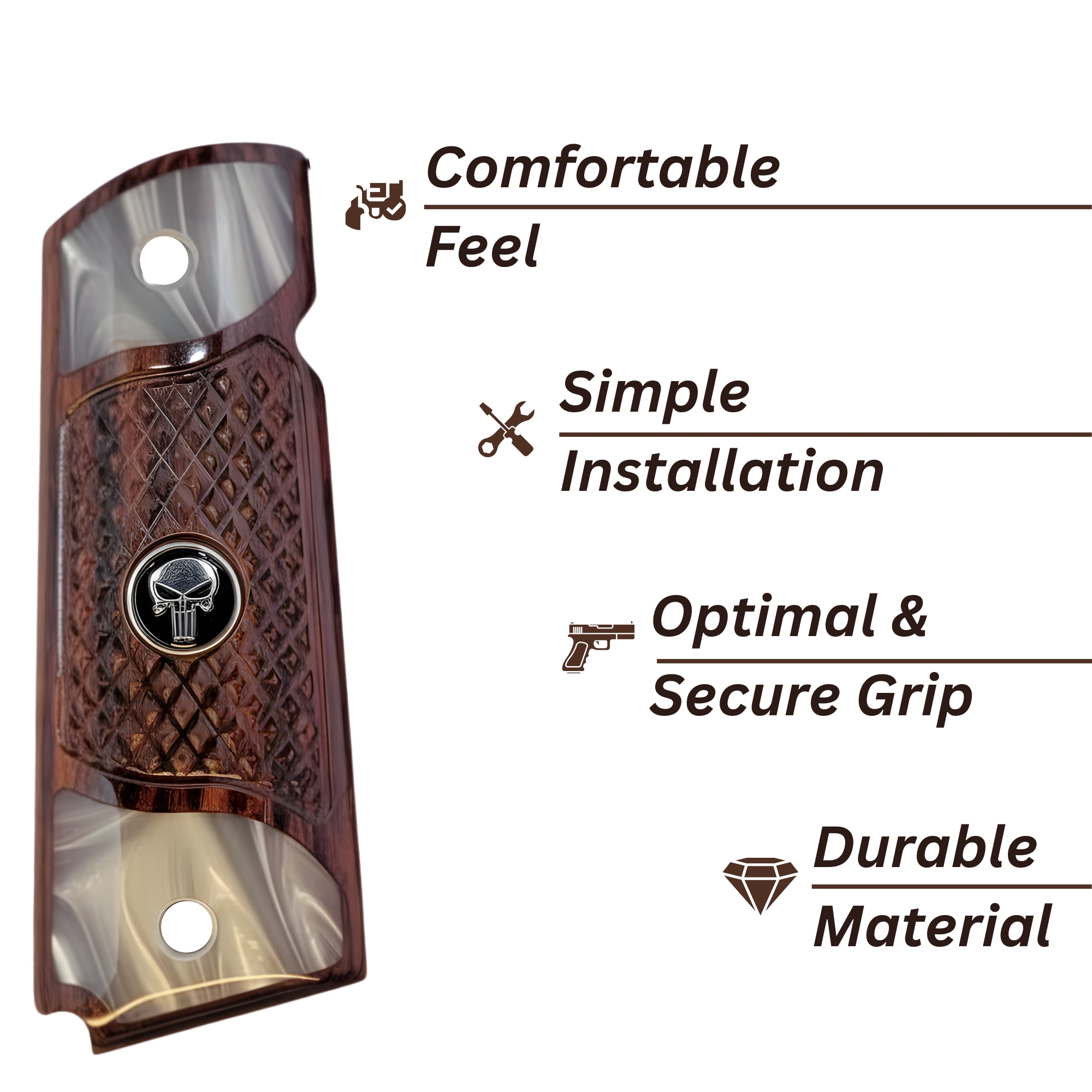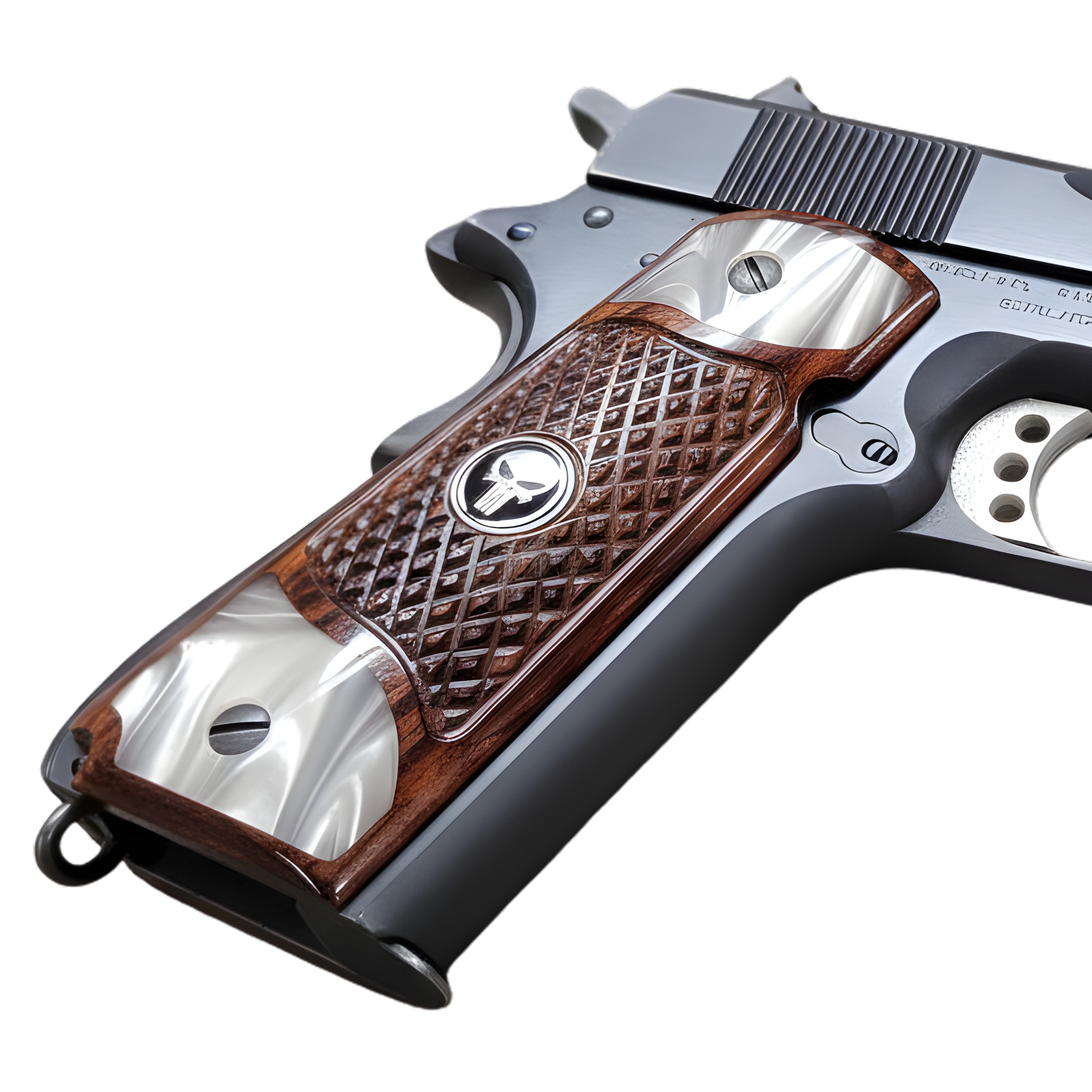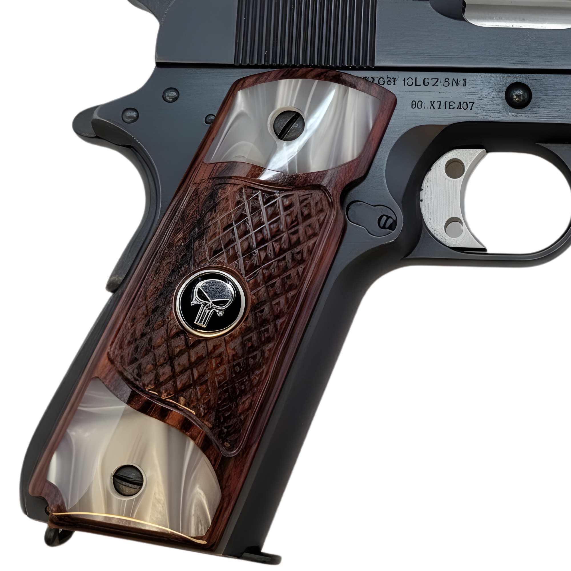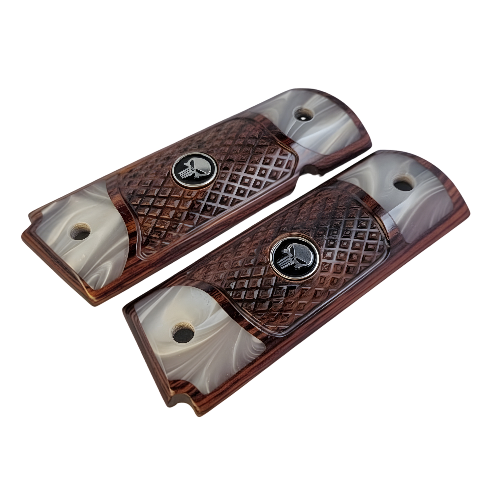 1911 Full Size Checkered Rosewood and Acrylic Pearl Grips with Black Punisher Medallion