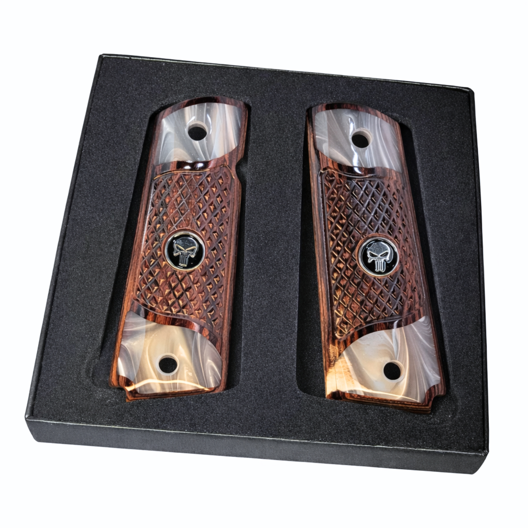 Home / New Product / 1911 Full Size Checkered Rosewood and Acrylic Pearl Grips with Black Punisher Medallion