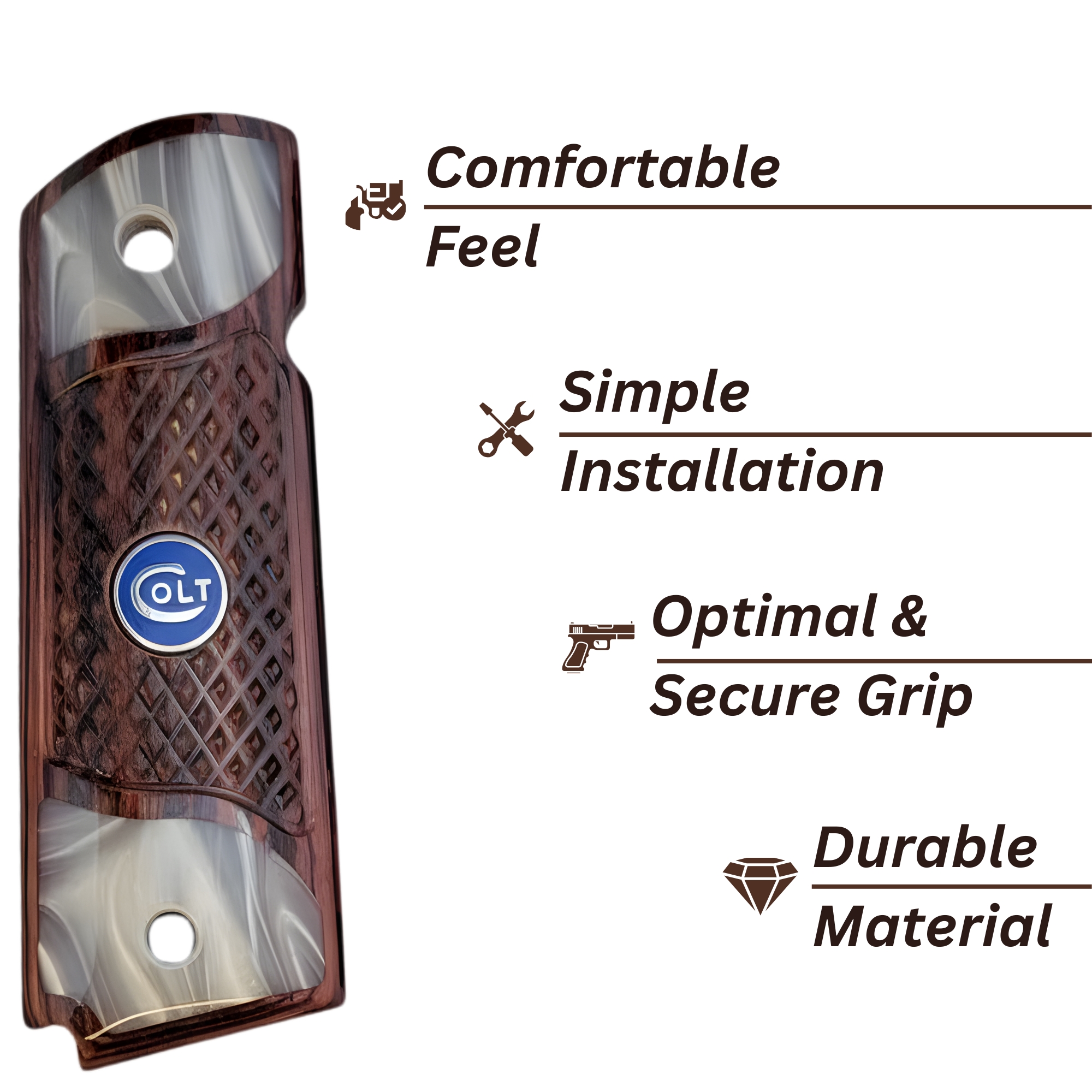 Add a touch of class and enhanced performance to your favorite equipment with these Full-Size Checkered Rosewood handles. Crafted for those who demand both beauty and utility, these grips feature a stunning acrylic pearl bottom accent and a classic medallion that complements any finish, from stainless steel to deep blued steel.
