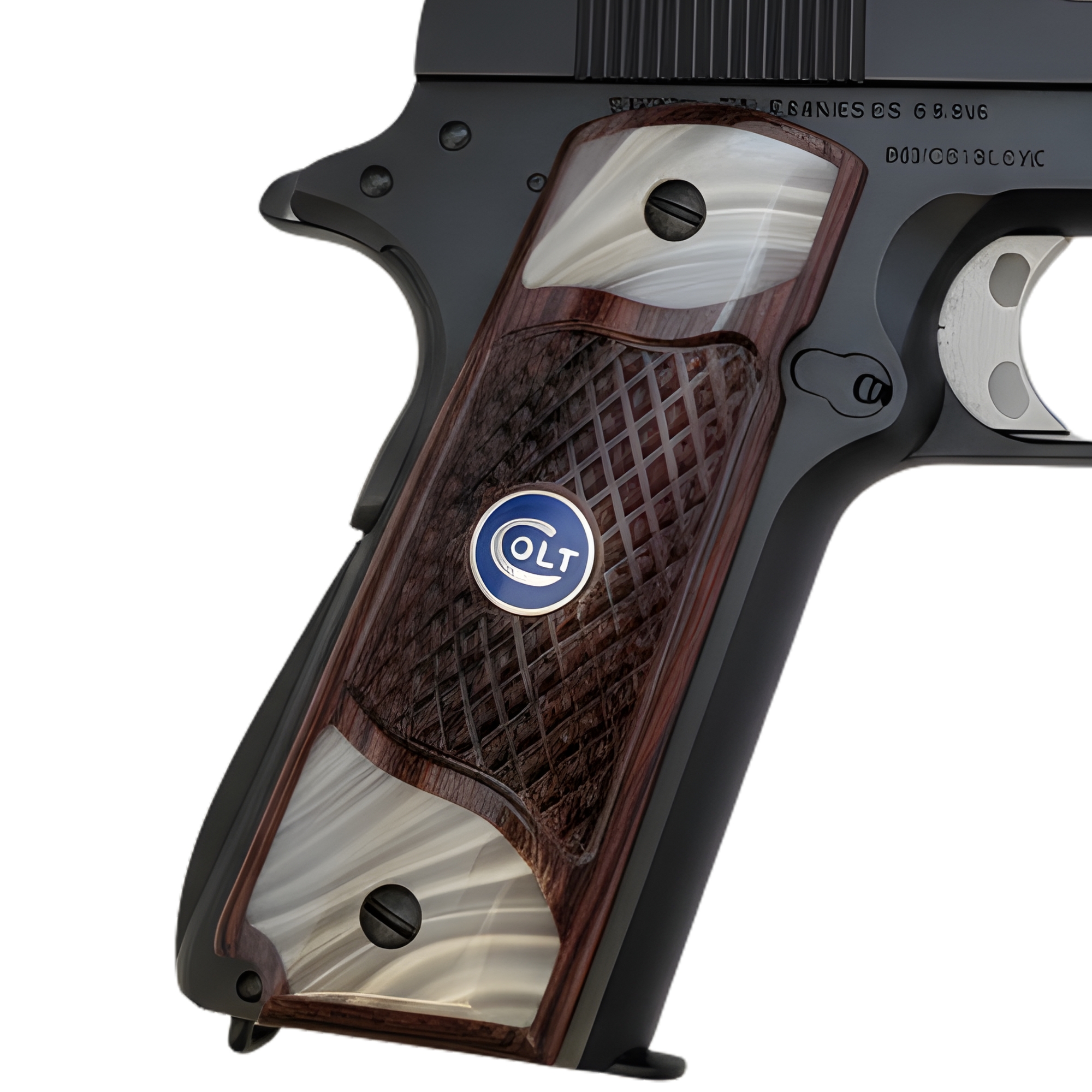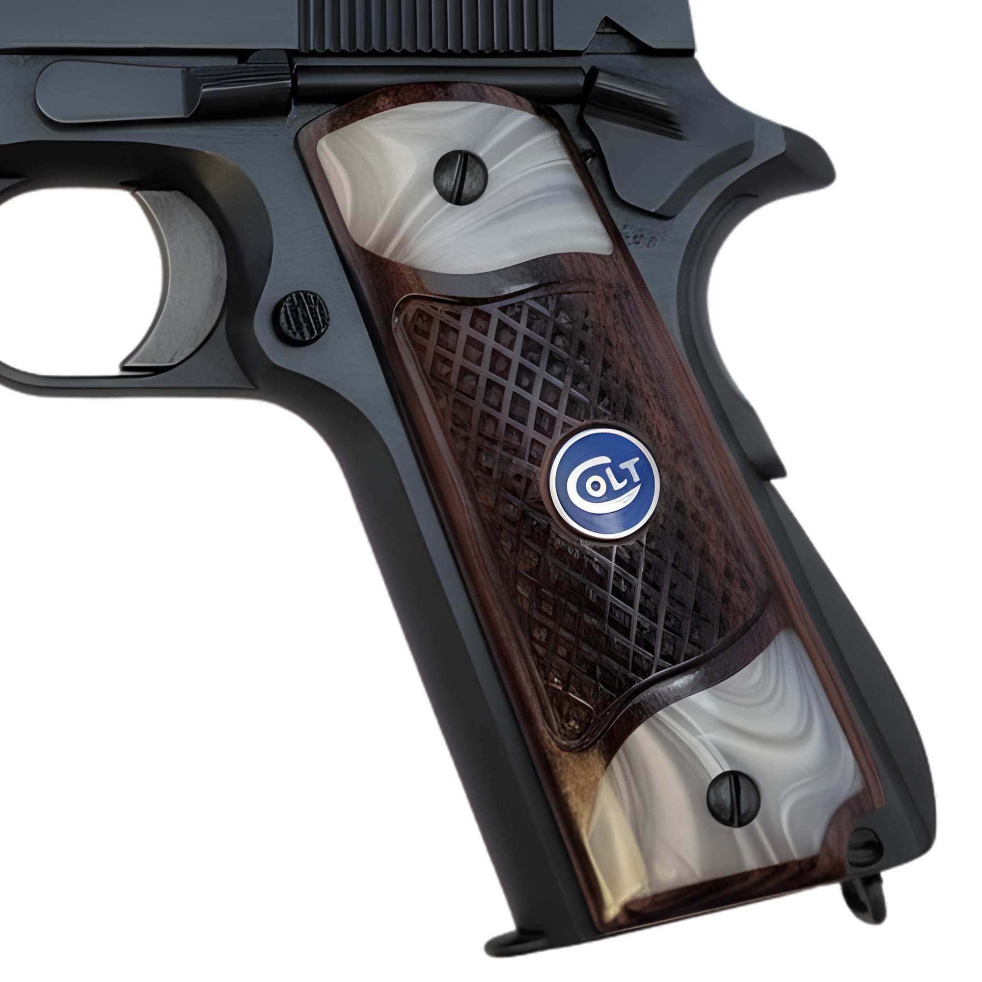 1911 Full Size Checkered Rosewood and Acrylic Pearl Grips with Blue COLT Medallion