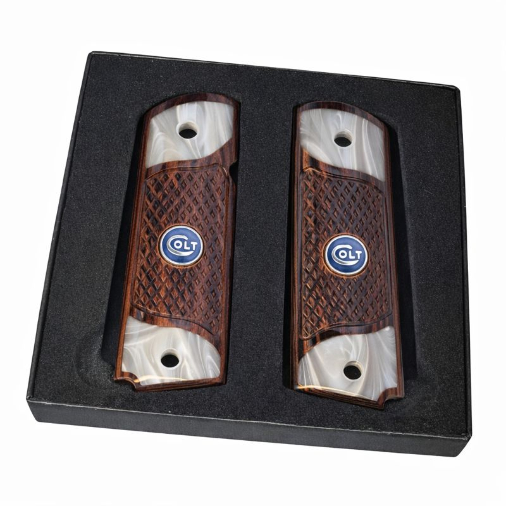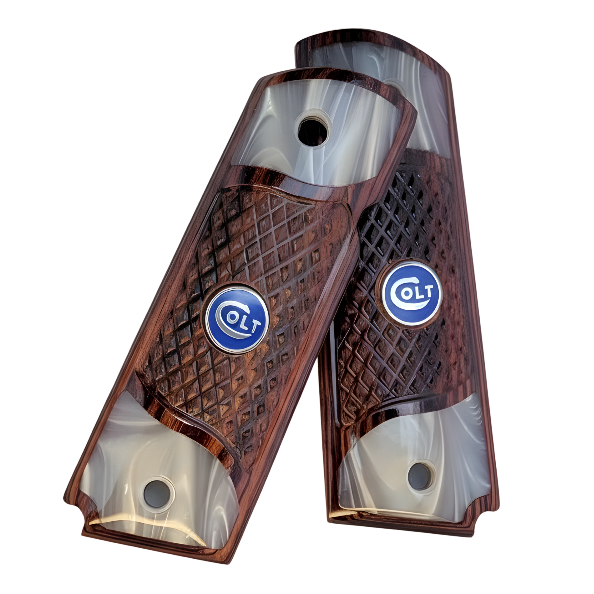 Home / New Product / 1911 Full Size Checkered Rosewood and Acrylic Pearl Grips with Blue COLT Medallion
