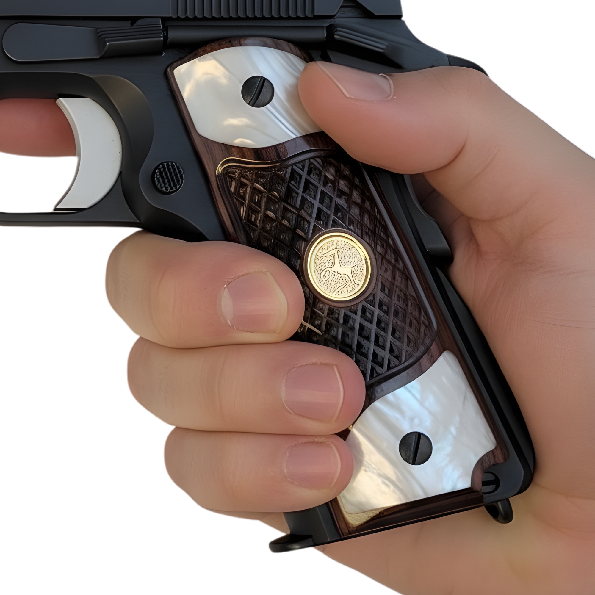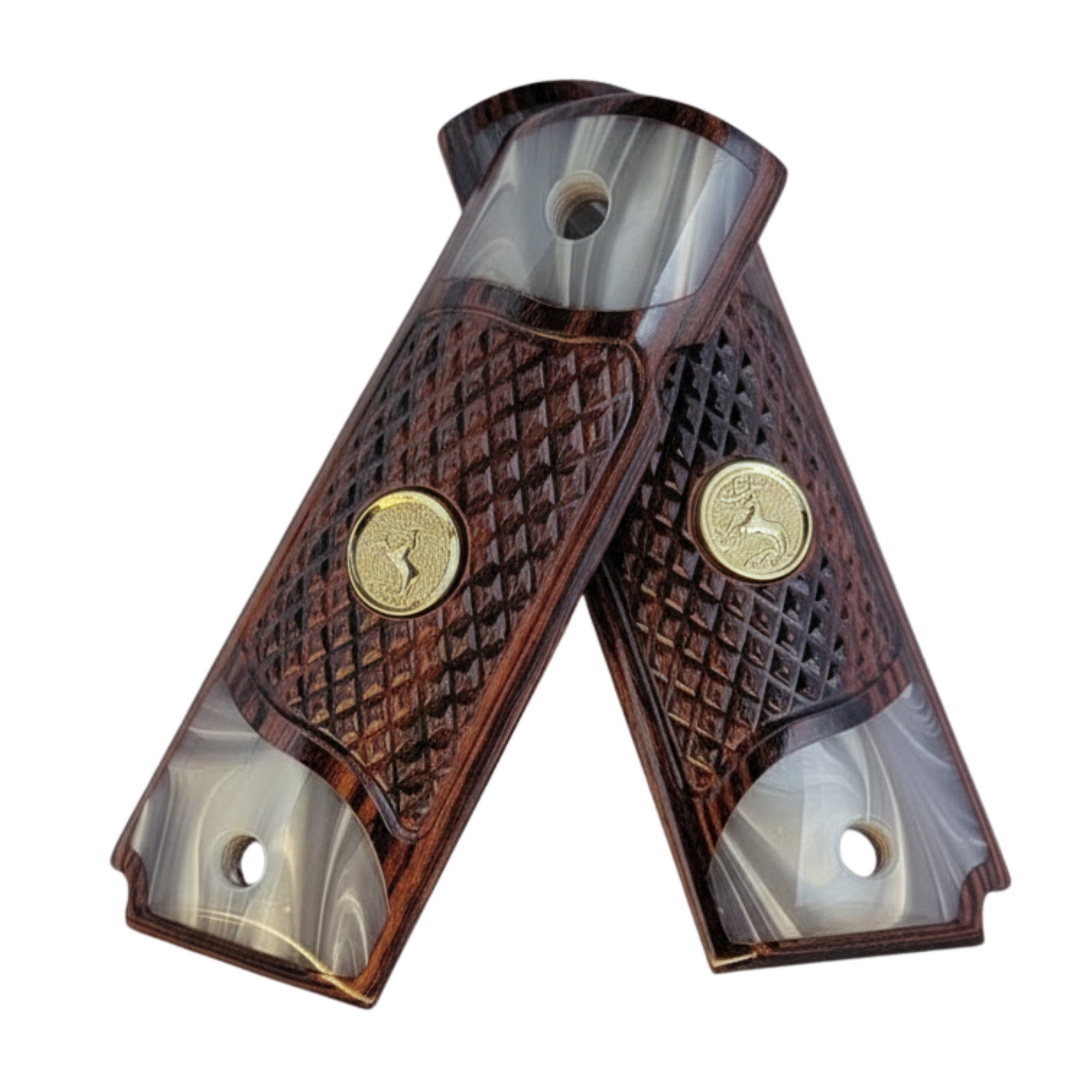 1911 Full Size Checkered Rosewood and Acrylic Pearl Grips with Gold Medallion with Rearing Horse