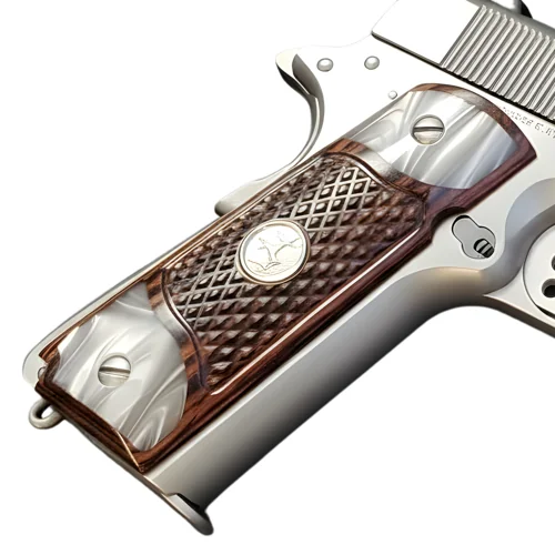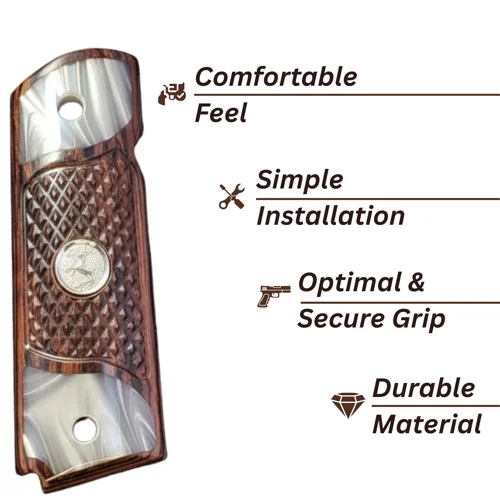 Material & Craftsmanship These 1911 wood grips combine checkered rosewood construction with an acrylic pearl bottom accent. Rich natural grain. Bright pearl finish. Silver hardware. Three elements that work together to create something genuinely collector-grade at an honest price. Among the finest Colt 1911 grips available for the full size government frame — in any finish, on any platform.