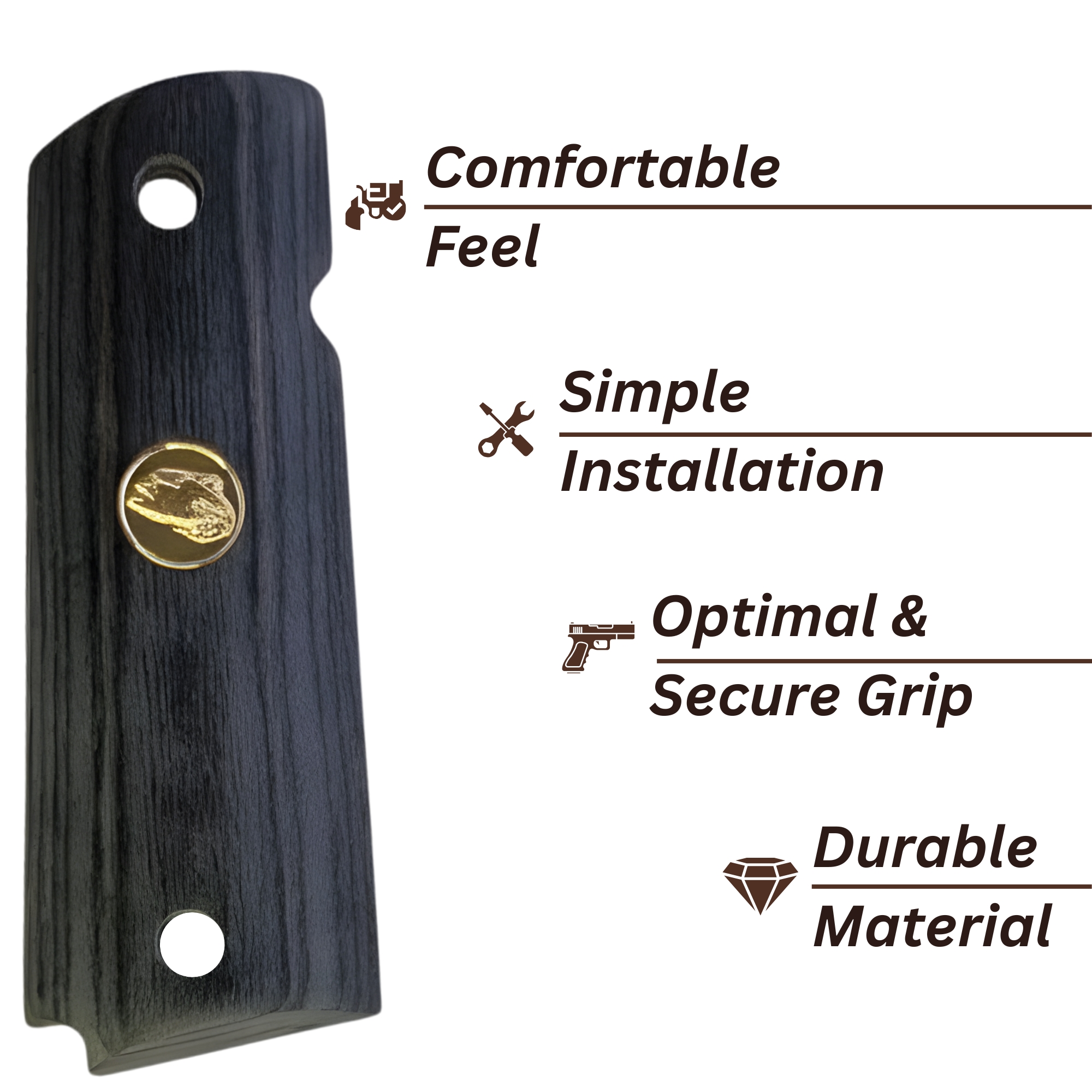 Transform your equipment with these custom-crafted Black Walnut handles, designed for those who appreciate the raw beauty of natural wood. These grips arrive in a cured, kiln-dried state, featuring a classic medallion and a sleek black finish. They are specifically designed with an Ambi-cut, ensuring full compatibility with ambidextrous safety setups.