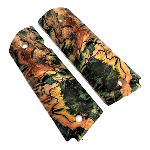 1911 Full size Grips Faux Spalted Maple Spalted maple is a type of wood that has been affected by fungus. The spores of the fungus enter the wood through cracks or wounds, and as the fungi grow, they produce patterns called “spalting.” These patterns can be very beautiful, and spalted maple is often used in making furniture and other decorative items.