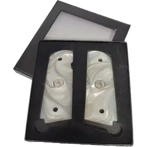 The polished pearl white acrylic finish is weatherproof, scratch-resistant, and holds its shine through regular carry and range use. Silver Colt medallions are inset into each panel for that classic custom 1911 look.