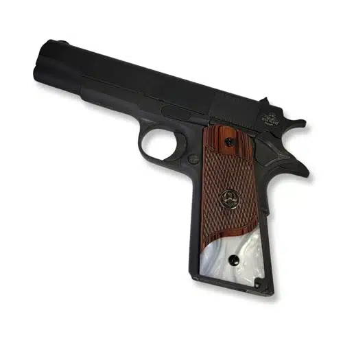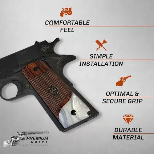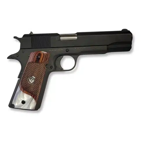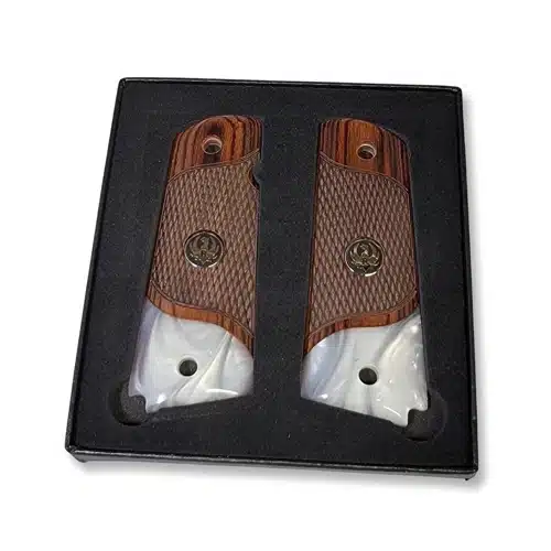 1911 full-size rosewood with white pearl acrylic grips with black enamel and silver Ruger medallions. The grips are made of high-quality rosewood carved and shaped with CNC fabrication. The bottom accent in white pearl is high-quality acrylic in white pearl. The medallions are silver Ruger with black enamel set into the grips. These grips are impact resistant and durable. These are ambi safety cut.