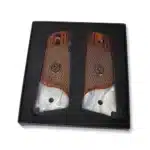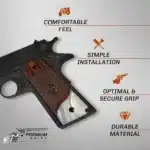 Specs at a glance: Material: CNC-carved rosewood + white pearl acrylic accent Medallions: Black enamel silver Ruger Cut: Ambidextrous safety cut Durability: Impact resistant Fits: Full-size 1911 Government & clones
