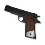 Shop 1911 rosewood grips with white pearl acrylic accent — a premium combination of CNC-carved rosewood, white pearl acrylic, and black enamel Ruger medallions that turns a standard Government model into something worth showing off.