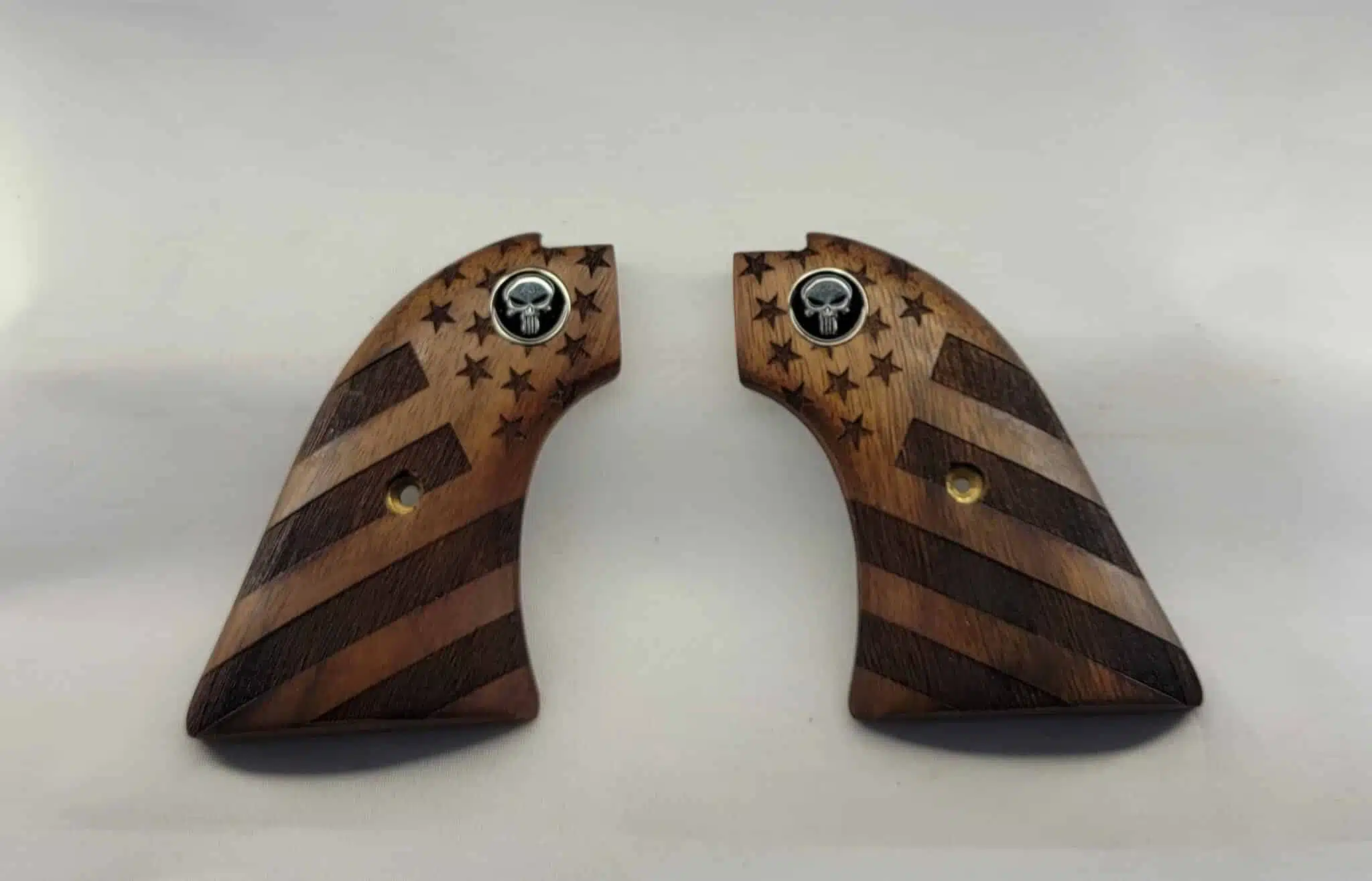 Each panel is master-crafted from solid walnut and features a beautifully detailed carved American flag design that wraps fully around the grip face — dimensional woodwork that gives genuine visual depth rather than a flat printed or painted finish. The Black Punisher medallion is integrated cleanly into each panel, sitting flush against the warm walnut grain and delivering a sharp contrast that makes this set immediately recognizable on the range or in the display case.