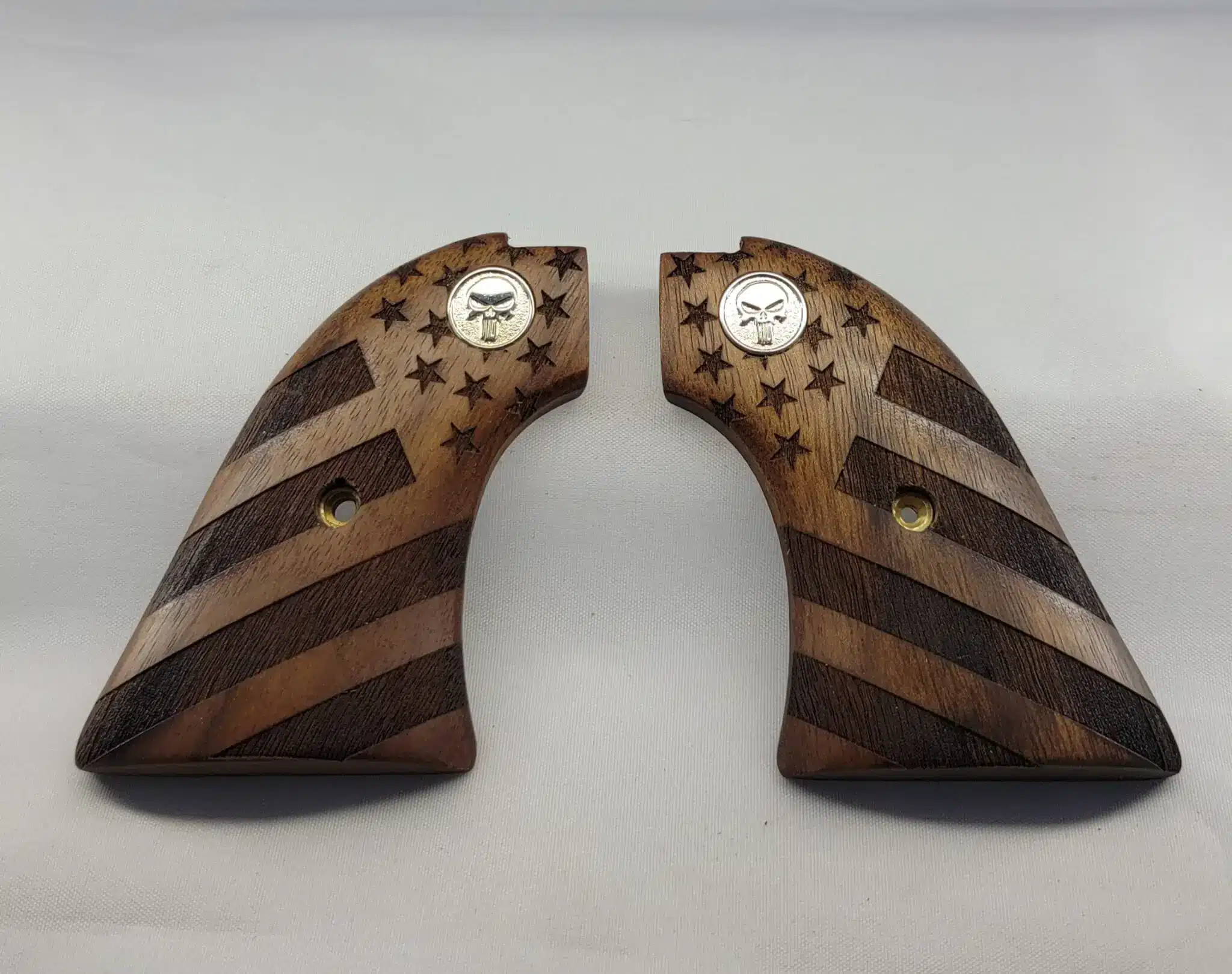 Each panel is master-crafted from solid walnut and features a beautifully detailed carved American flag design that wraps around the full grip face. This isn’t a printed surface or a decal — it’s dimensional hand-carved woodwork that gives the walnut genuine visual depth and a custom appearance that holds up under real scrutiny. The Silver Punisher medallion is integrated cleanly into each panel, contrasting sharply against the warm walnut grain and adding a bold, tactical edge that complements the flag carving without competing with it.
