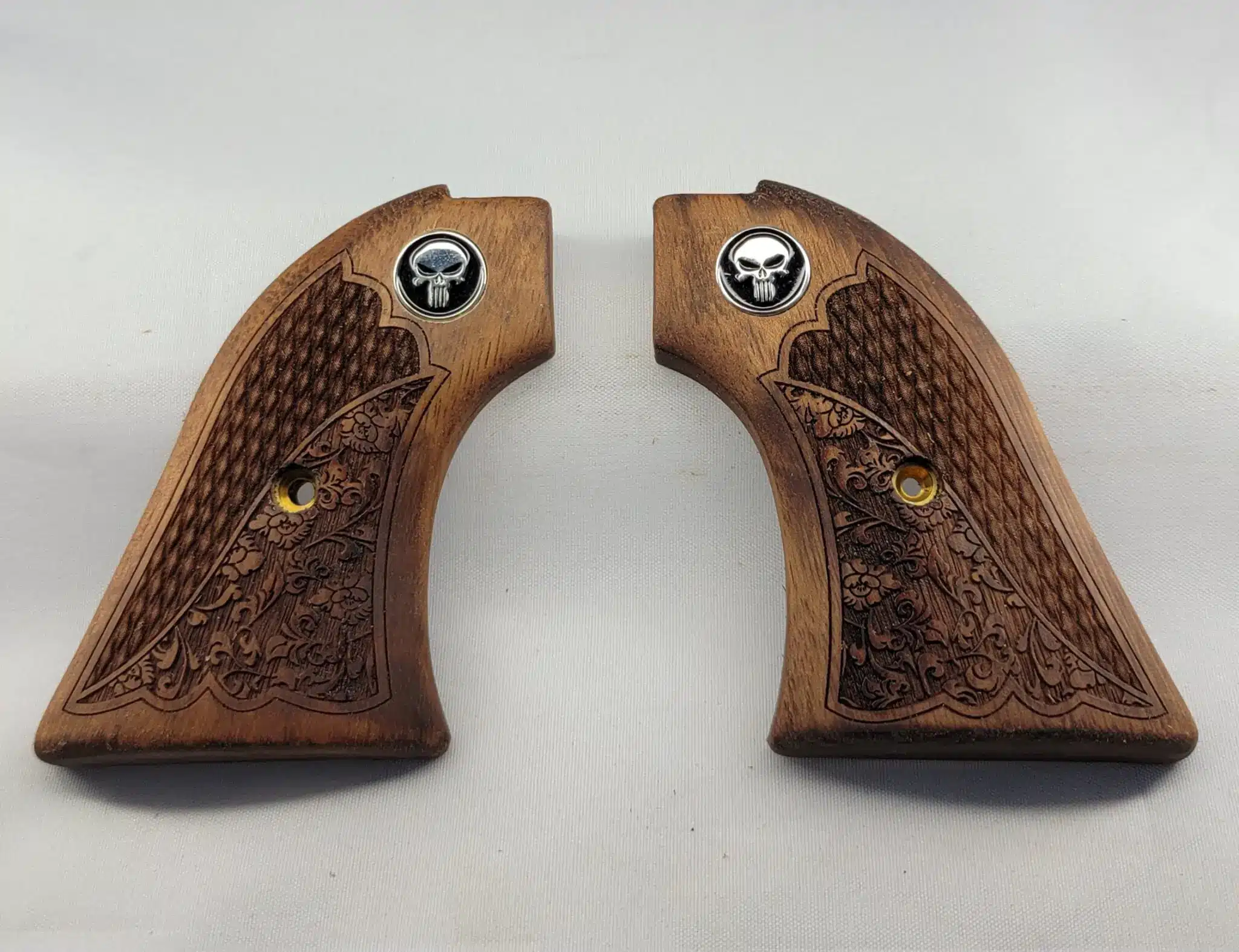 Each panel is crafted from high-quality solid walnut and features a sophisticated combination of traditional checkering and a hand-carved oakleaf pattern across the grip face — firm, natural, and confident in hand through every cylinder rotation. The centerpiece is a striking Black Punisher medallion inset cleanly into each panel, adding a bold, tactical edge that contrasts sharply against the warm walnut grain.
