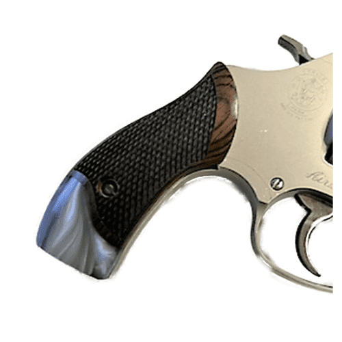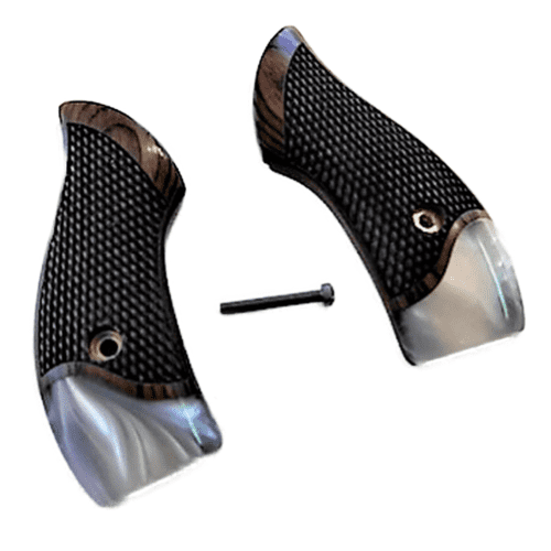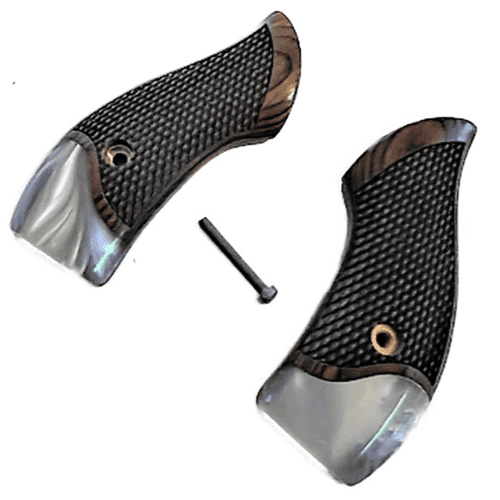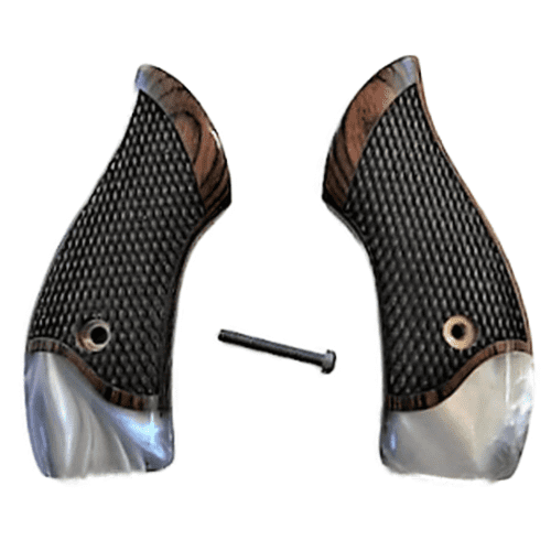 Professionally made High quality Rosewood and Pearl. While smaller than OEM grips but provides a nice classic concealable pistol. These grips are for Smith & Wesson J frame. These come with a grip screw as well. Comes in display gift box. Real Mother of Pearl Grips (not produced and unavailable) can’t handle pressure impact and cracks easily if dropped. These grips are the closest in color with the greatest of strength to the real thing. Made from high impact acrylic and for this model it has an incredibly high luster and great appeal. Comes with screw. Finished in the Mountains of Western NC.