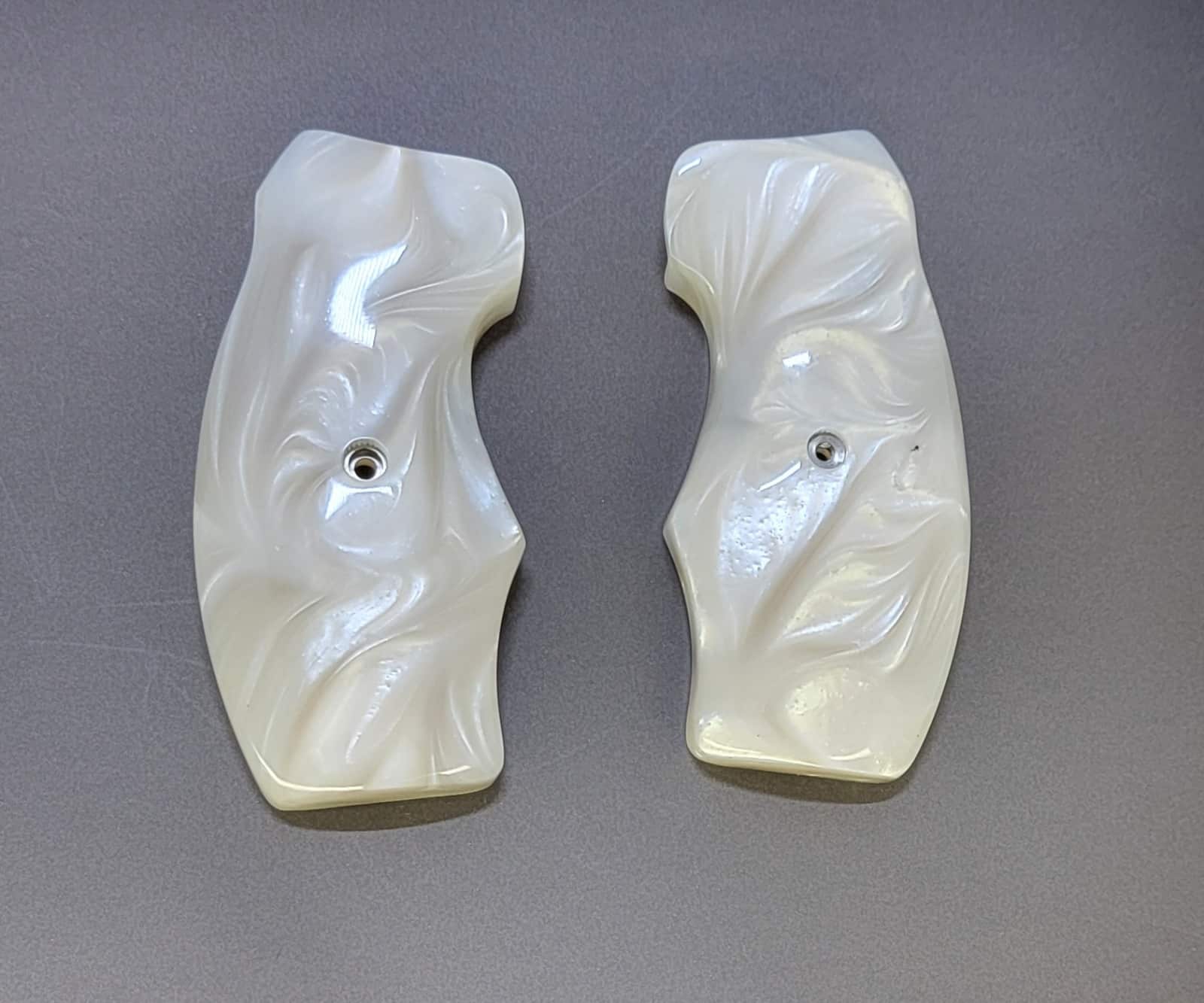Upgrade your Rock Island M200 or M206 revolver with these stunning white pearl acrylic wrap-around grips, precision-crafted using CNC technology for a flawless, consistent fit every time. Unlike the stock OEM plastic grips, the M200 version features an oversized wrap-around design that extends further around the frame, giving you a fuller, more ergonomic hold for superior control, reduced recoil, and improved accuracy shot after shot. The gorgeous white pearl acrylic finish adds a striking, eye-catching look that stands out on any finish. Installation is fast and hassle-free — all required pins and mounting screws are included. These grips arrive beautifully packaged in a display gift box, making them an ideal gift for any revolver enthusiast.