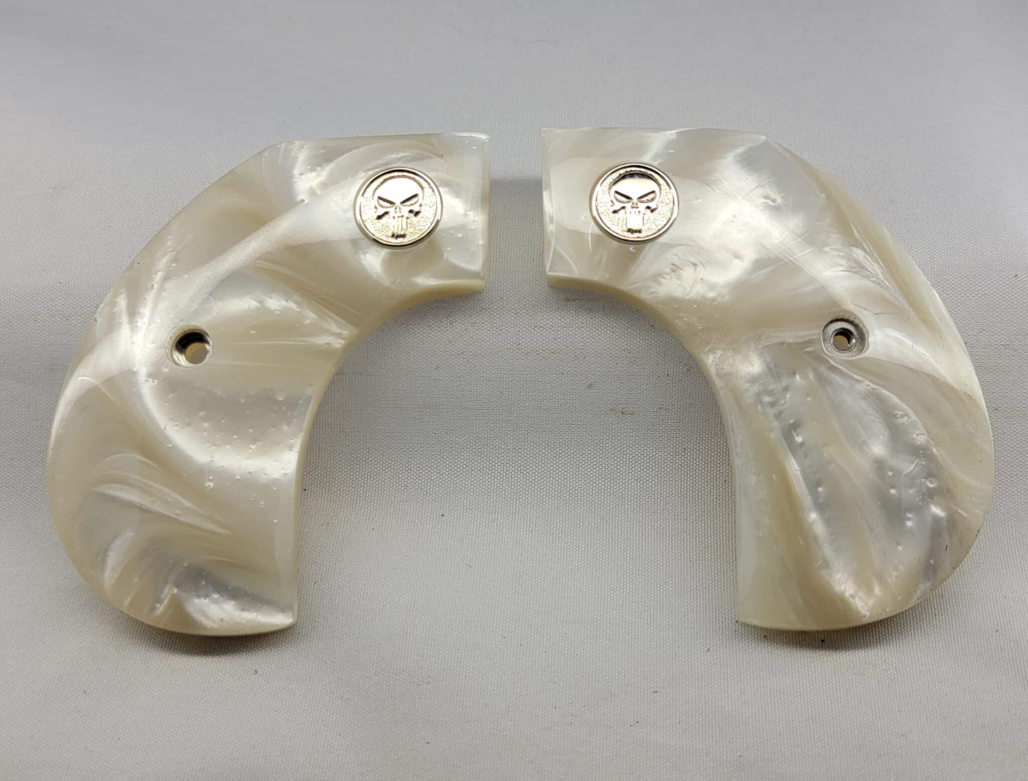 Ruger Wrangler Birdshead Grips in White Pearl Acrylic with Silver Punisher Medallion