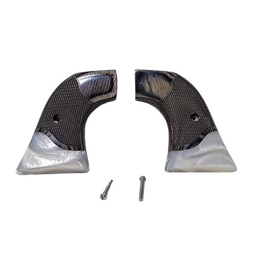 These Ruger Wrangler Gentleman Black Rosewood White Pearl Grips are made of black rosewood laminate with a white pearl acrylic accent. The black rosewood is checkered and shaped using CNC technology. The bottom accent of high-quality white pearl acrylic is a striking addition to the wood grip. The acrylic is durable and weather-resistant, unlike real pearl.