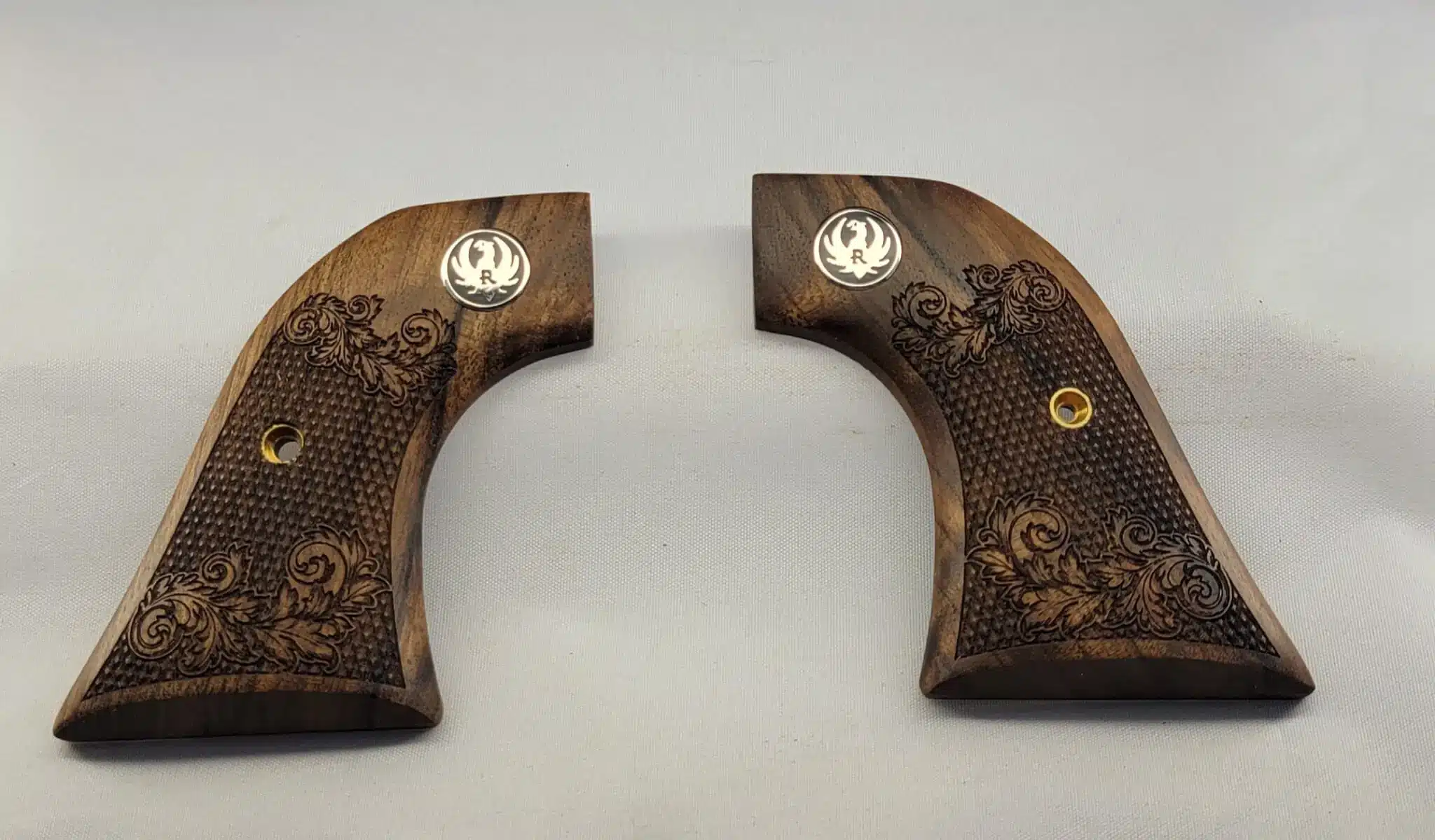 The classic scroll pattern doesn’t just look stunning — it creates a naturally textured surface that gives your shooting hand a more secure hold and noticeably better control. The flush-set black Ruger medallion keeps the look clean, brand-authentic, and perfectly matched to both blued and cerakoted Wrangler frames.