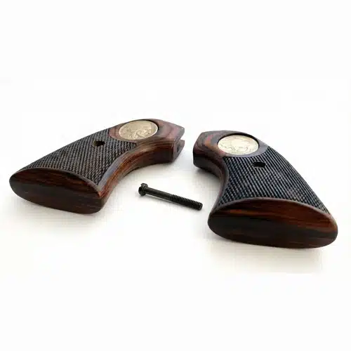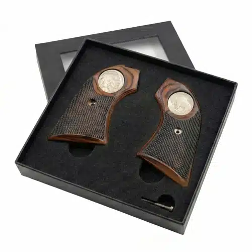 Crafted from solid checkered rosewood, these grip panels offer a noticeably more secure hold than factory-installed grips, with a warm, rich grain that suits the Rough Rider’s Western revolver aesthetic naturally. The standout feature is the Buffalo Nickel medallion — a classic American coin-inspired detail that gives these grips a distinctly vintage, collectible character you won’t find on a standard rosewood set.